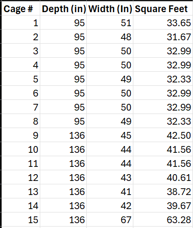 The cages on the side of the basement closest to the door are roughly 32 square feet each. The cages on the side of the basement furthest from the door are roughly 41 square feet with one outlier in #15.